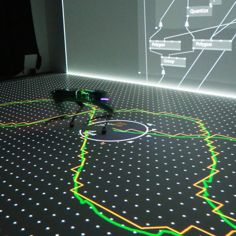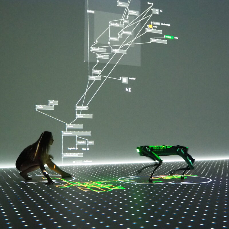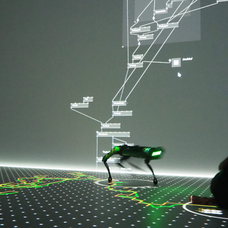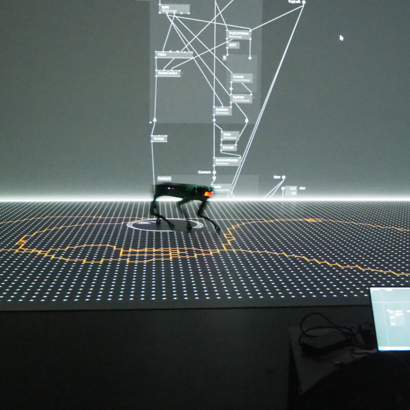 The core idea of the research originated in early 2021 when Amir Bastan had the opportunity to work with Spot, BostonDynamic’s quadruped robot, for an Interactive Installation. With generous support from Qapture GmbH and Creative Robotics, he embarked on developing a wrapper for Spot’s SDK in vvvv. Throughout the summer of 2021, several weeks were spent at the Linz OIC, where he worked closely on Spot in a dedicated room. The main goal was to create a utility to facilitate a compelling narrative that fostered meaningful interaction between the audience and the robot. During this process, Bastan found himself drawing inspiration from *Josef Beuys’* iconic performance piece, “I Like America and America likes me.”