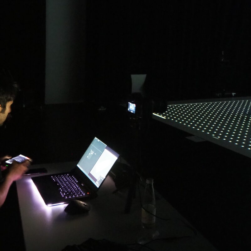 Custom-made software is written in vvvv and controls the robot in real-time; while the dancer is performing alongside the robot on stage, the robot’s movement is being recorded under the software’s hood. It passes several filters to extract the movement features. The accuracy of those features then becomes the transition trigger for a *Finite State Machine* which defines the behaviour of the robot during the performance.