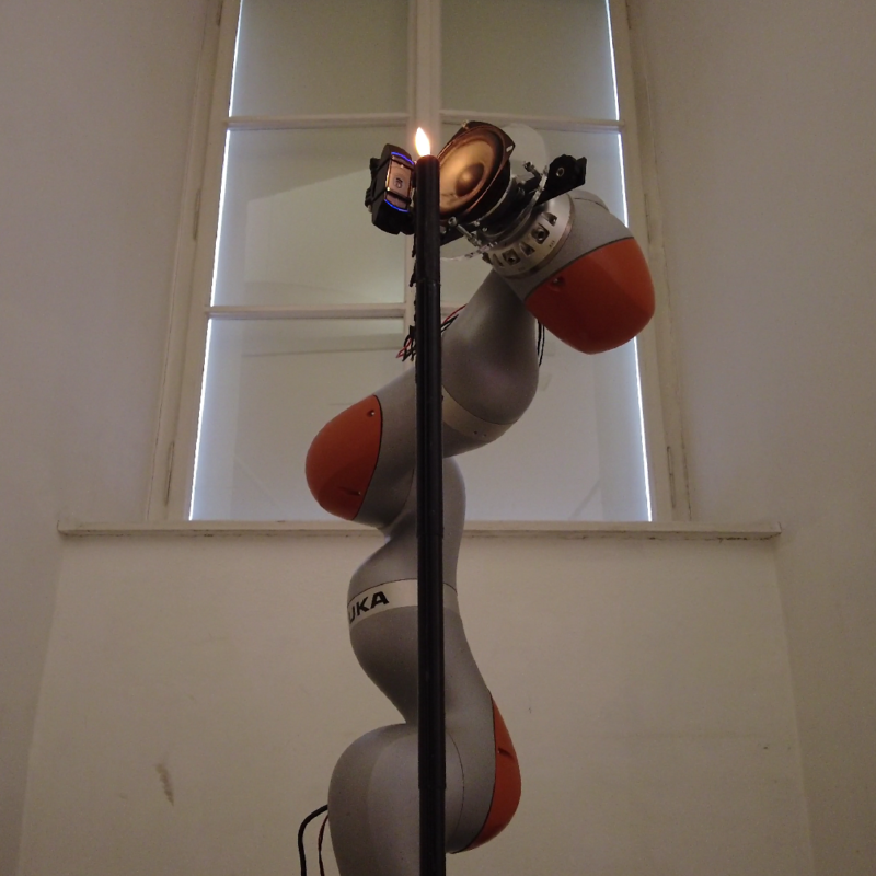 industrial robot equipped with a loudspeaker to float around a tall candle and challenge the