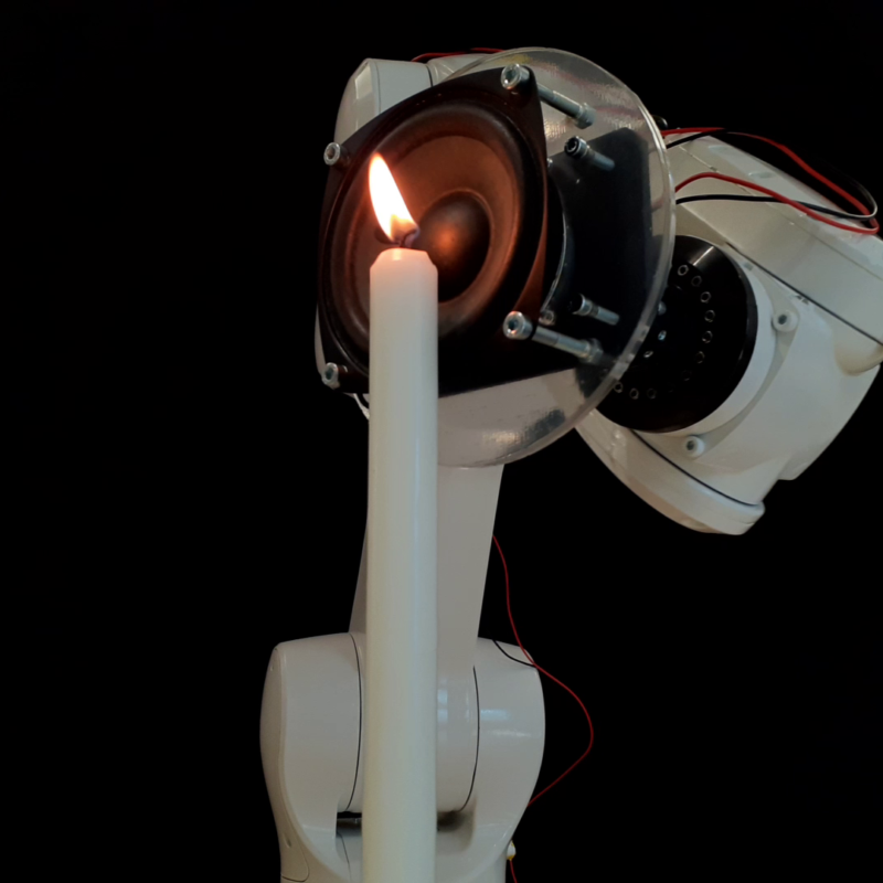 fragility of the flame by producing low frequency sounds. The robotic arm moves the