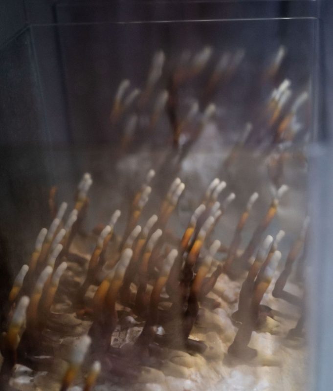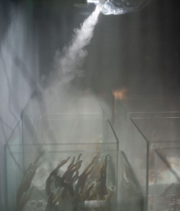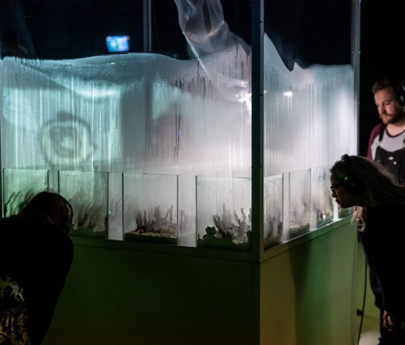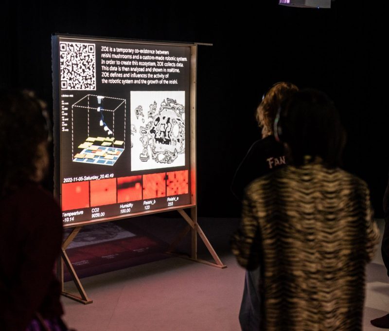 ZOE is a temporary co-existence between the reishi mushrooms and a custom-made robotic system. Noor Stenfert Kroese and Amir Bastan explore with ZOE the possibilities of internal communication between its robotic system and reishi. Within this seeming paradox between nature and technology, an ecosystem occurs that cares for and affects each other through sensing technologies. A tactile space of data visualisations is created around ZOE in which visitors can explore ZOE’s outcome.